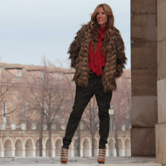 Muchas de vosotras me preguntasteis por la camisa blanca con el lazo.  Y yo os contaba  que también había caído en rojo sangre.  Aquí la tenéis, junto con un abrigo de pelo que este año se ha hecho más fuerte en algunos de nuestros armarios.  Ya me habéis visto con chalecos de pelo, y esta vez, me he lanzado con el abrigo.  Creo que con pitillos lo voy a usar muchísimo.