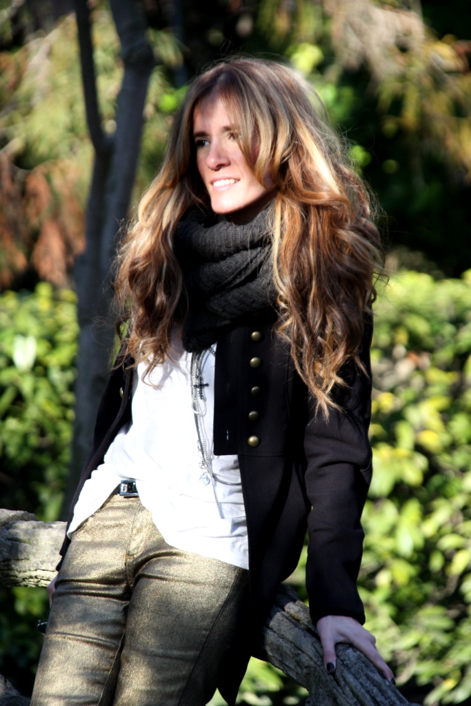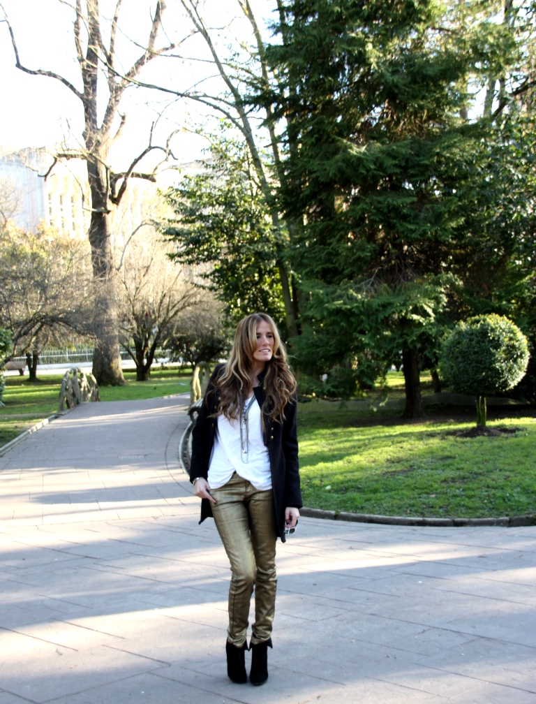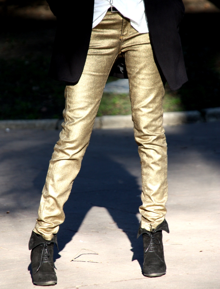 Hoy os traigo unos pantalones dorados que creo que van fenomenal para una cita nocturna. Me encantaron en cuanto los vi, y por no esperar a ese evento especial, les he dado un toque informal con las cuñas y la casaca para poder llevarlos a la oficina. Pero imaginadlos con un blazer, taconazo y clutch, todo en negro. Me parece un modo elegante de huir del típico vestido. ¿Cómo os gustaría más, formal o informal?