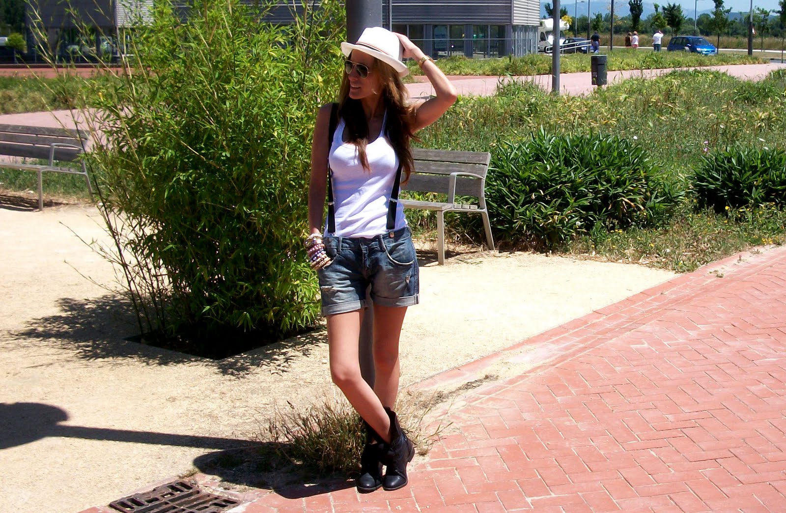 Como veis, para el sábado, tacón, blazer, pendientes, clutch y camisa.  Para la mañana del domingo, botas de estilo militar, tirantes y un borsalino que disimulara el desastre que era mi pelo.This is the title I´ve thought to show you how I´ve combined two different denim short in two different moments: last saturday night for a dinner with my friends and a sunday morning, 15 hours after, with a loooooooooooong saturday night on my back, desiring a coffee and feeling very very lazy!