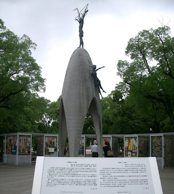 b. Monumento de las pajaritas. En honor a Sadako, una niña que sobrevivió pero que desarrolló leucemia debido a la radiación. Creía que, si animaba a todos los escolares del mundo a hacer miles de pajaritas de papel, se salvaría. No fue así, pero todas esas miles de pajaritas están aquí expuestas en memoria de esta niña (al fondo).