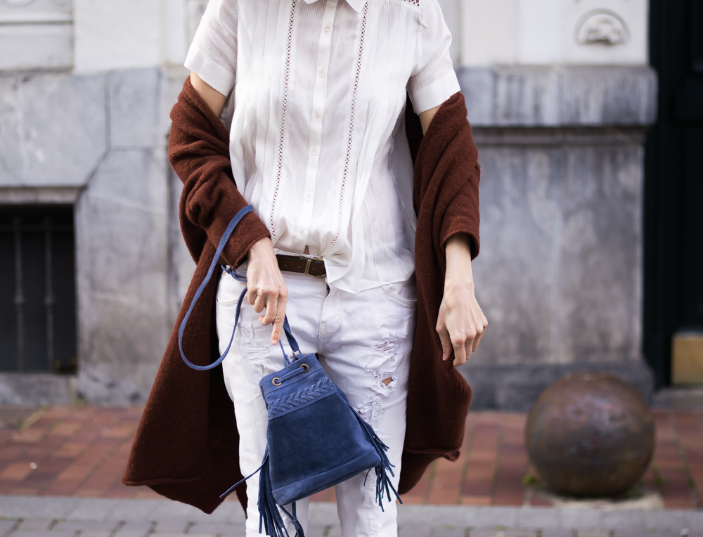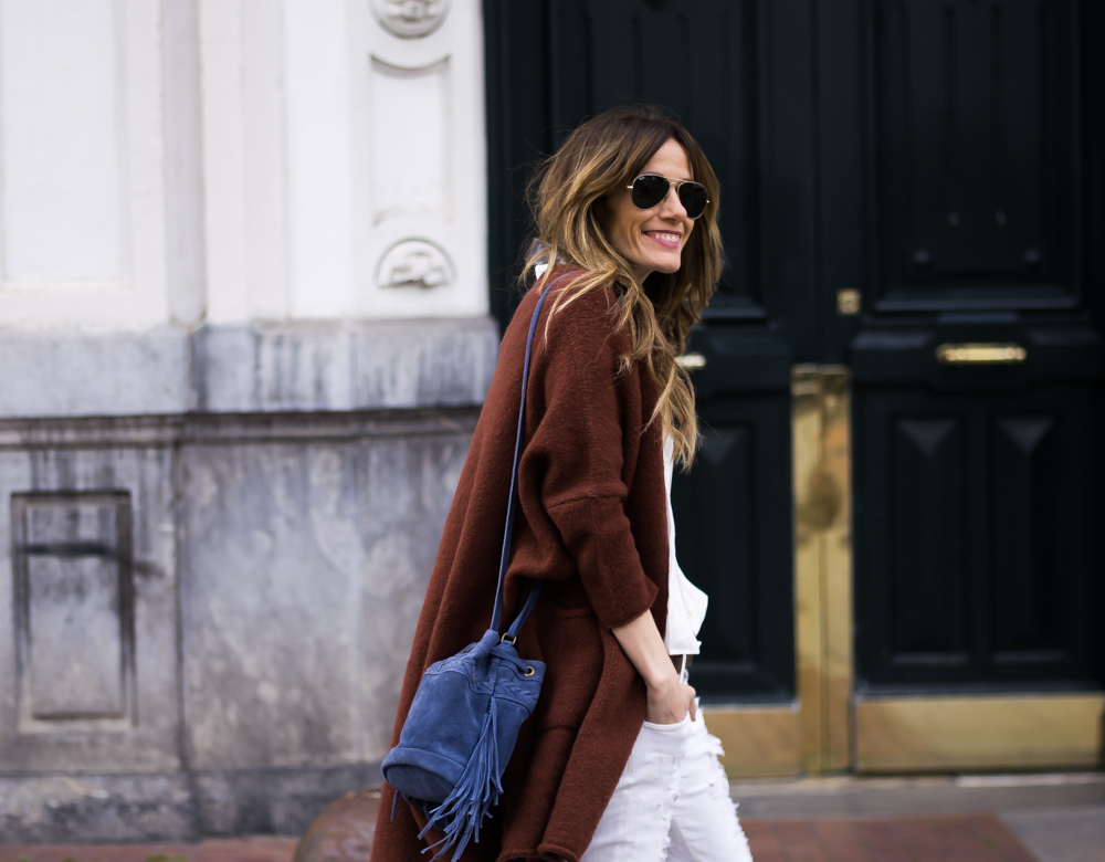 ¡Es súper chula! me encanta con el total white, además los zapatos son ideales, y el toque de color del bolso queda genial.