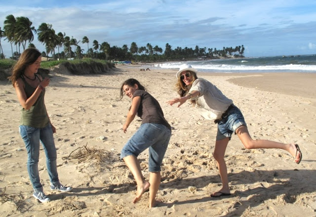 Mi último post sobre Brasil, ¿os he aburrido mucho? Conocimos a tres españolas simpatiquísimas y fuimos juntos a Praia do Forte, un pueblo con una reserva natural de tortugas y otras especies.  La playa, además, muy poco explotada, un paraíso en el que perderse, disfrutar, jugar… como nosotras, que aprovechamos la soledad para intentar bailar capoeira sin éxito 🙂