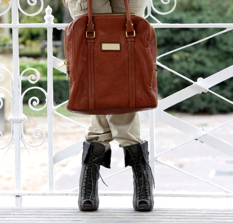 ¿Recordáis estos zapatos de Christine Centenera? Me encantan, así que cuando vi estos botines en Sfera fui a por ellos. ¡Al menos se parecen en el color, ja, ja! Al verde militar sumé los colores de este otoño, marrón y camel. Para terminar, uno de los bolsos de la nueva colección de Bimba&Lola, perfecto para llevar un poco de todo.