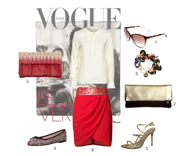 1. Gafas LE SPECS 2. Clutch dorado AKKESOIR 3: Sandalia dorada JEAN MICHEL CAZABAT 4. Bailarina brillantina PRETTY BALLERINAS 5. Clutch rojo RED VALENTINO 6. Pulsera AKKESOIR 7. Camisa MINT&BERRI 8. Falda CARLING