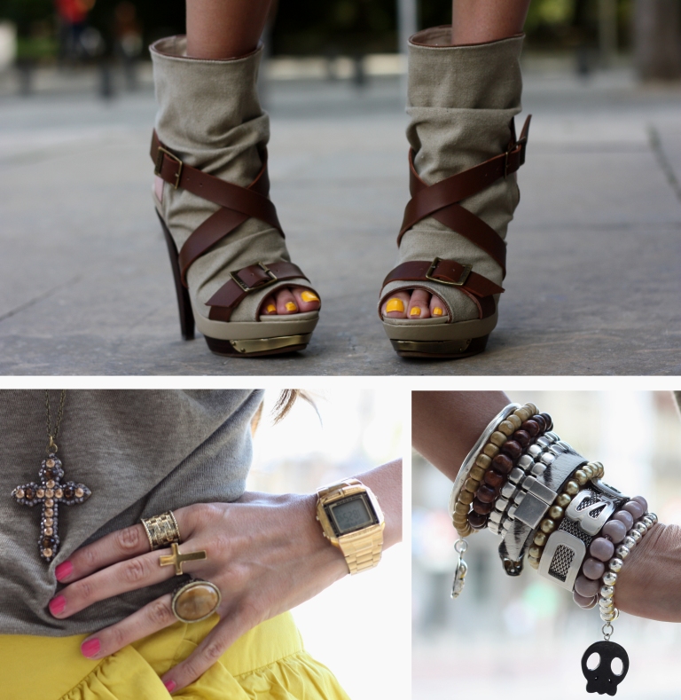 Hello! This is my first day at work, but I fancied coming back to my home after three weeks.  I need to do those vital things in our lifes such as facial cleaning, hairdesser, washer… haha!  What do I show you today? A «one color» look with different tones over the same green scale: khaki and mustard.  And I´ve found out a new shoes shop on line without shipping costs, Javari.co.uk.  Take a look, it´s got compelling proposals.  I think it might be difficult to find this kind of shoes in your own cities.  And I finish with my cute bracelets, I adore them.