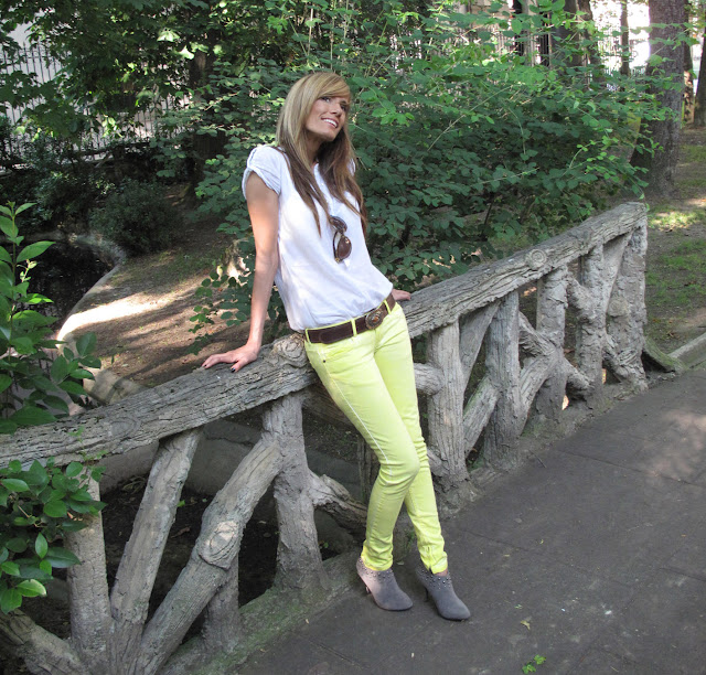 Tus fotos me inspiran mucho para vestirme, sigue así que este blogg es muy interesante. La verdad que nunca me he atrevido con los pantalones de colores, no he salido de la gama de azules, negros o el típico blanco para el veranito. Pero viendote me estoy animando y el viernes que tengo el día libre y pensaba ir de a las rebajas miraré por un pantalón de colores acidos o fluorescentes como el tuyo. Me gusta tu idea.